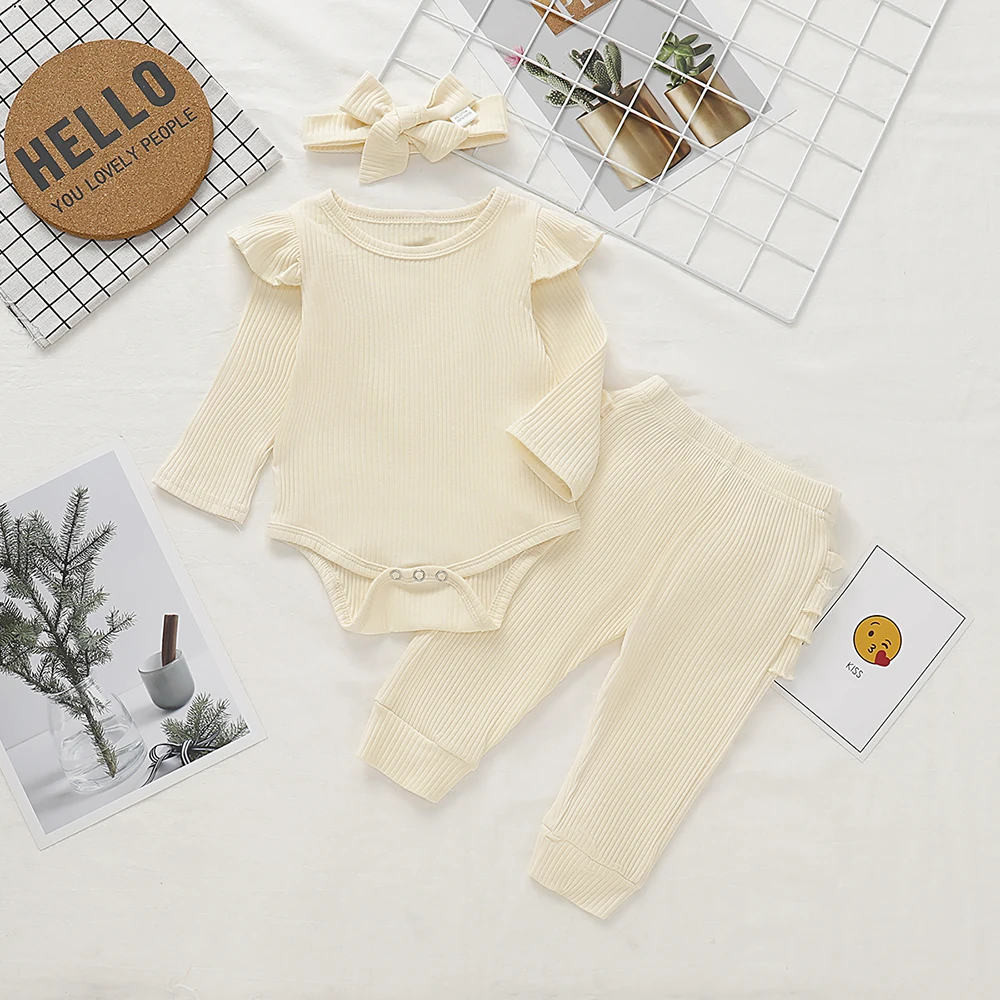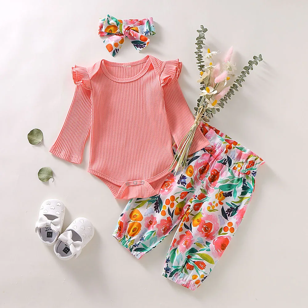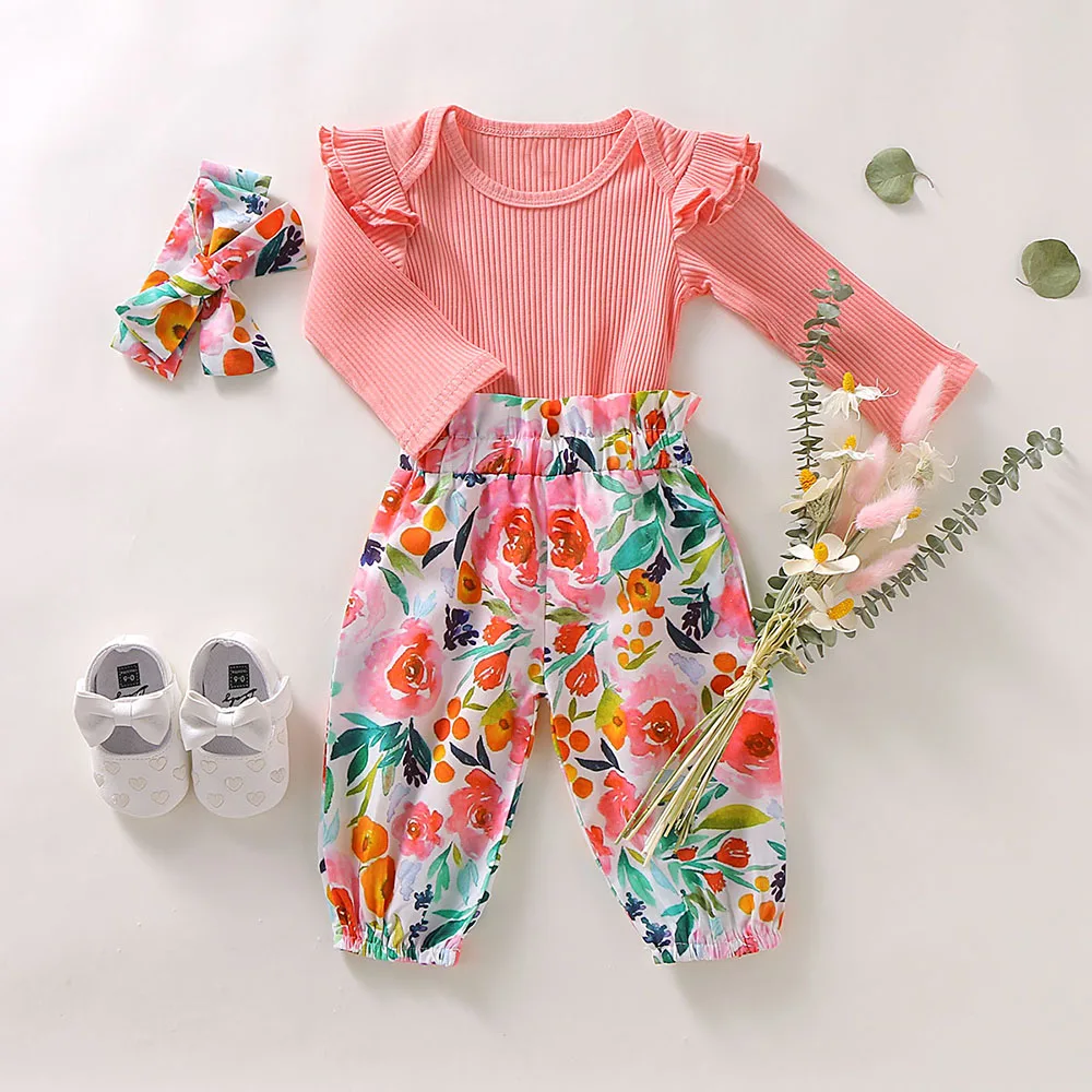 Cheap Offer of CYSINCOS 2020 New Spring Baby Girl Clothes 3pcs Newborn Ruffles Solid Romper Bodysuit+Floral Pants+